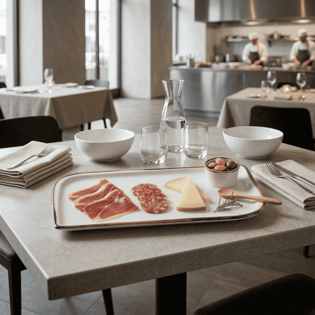Fabricada en porcelana resistente, soporta uso intensivo continuo en restaurantes y hoteles. Su diseño facilita montajes limpios y consistentes, mientras su superficie amplia permite trabajar presentaciones gastronómicas cuidadas sin saturar la mesa.