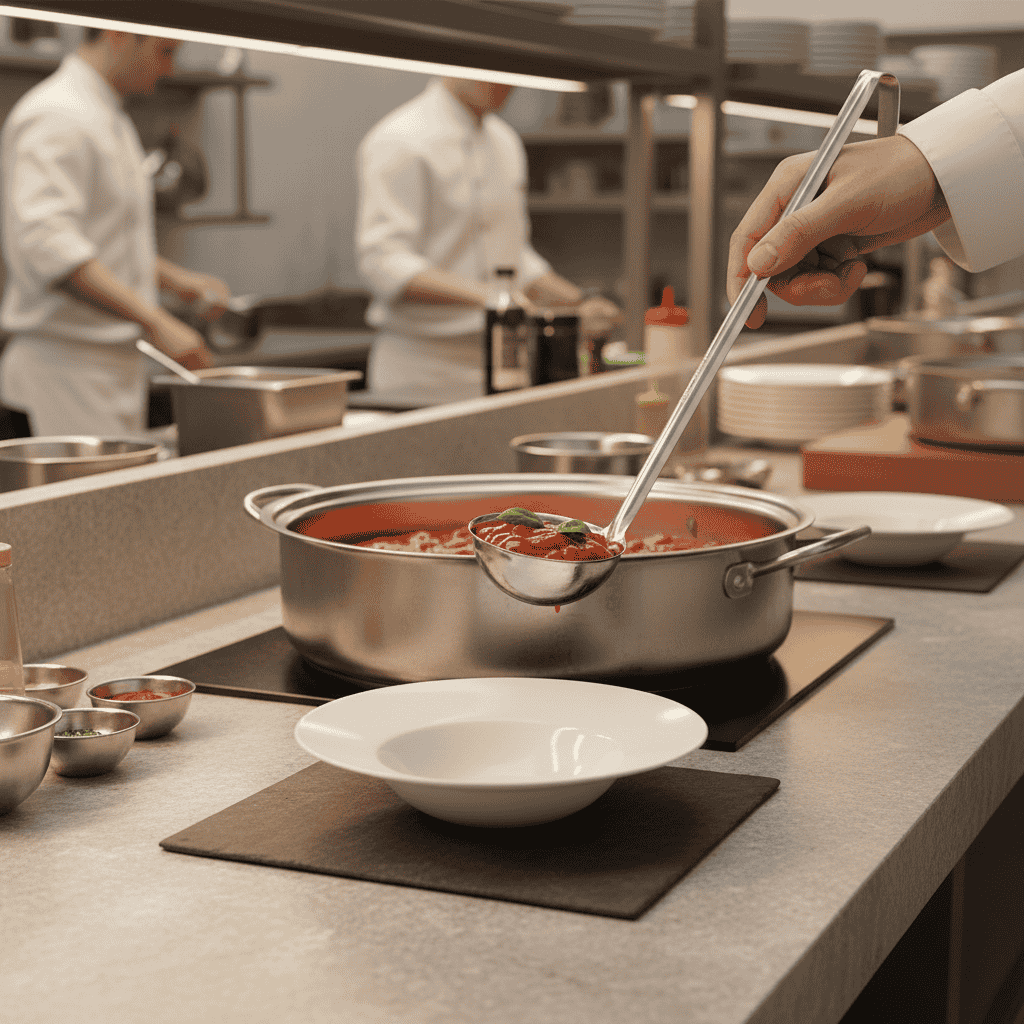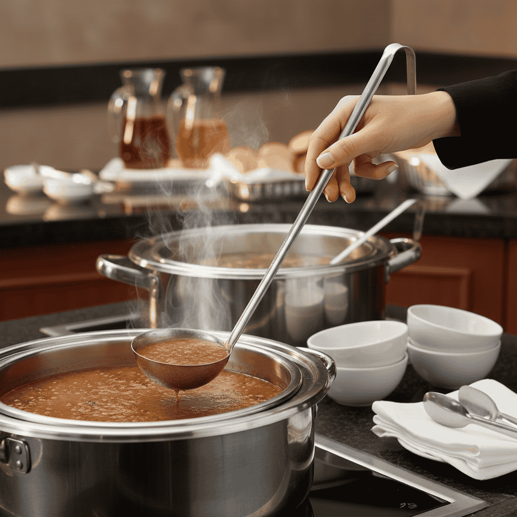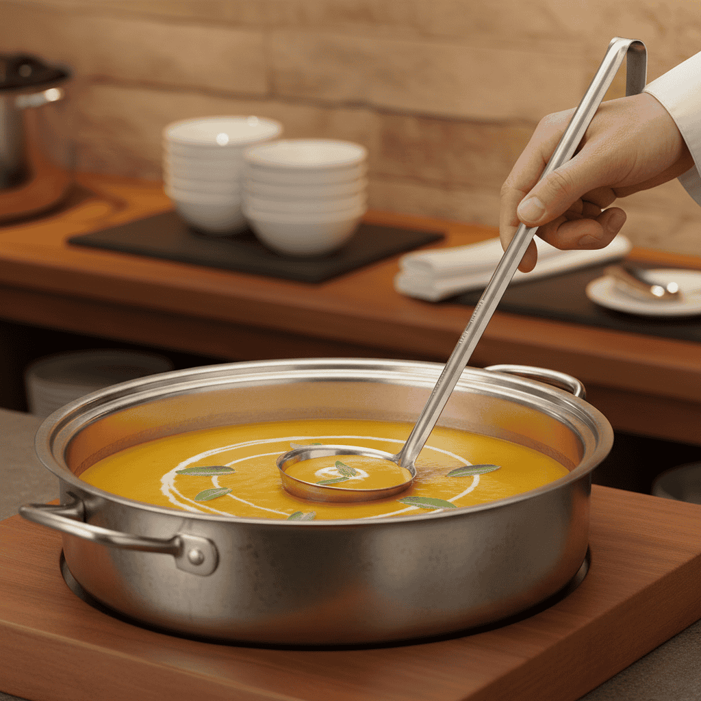 El cucharón profesional está diseñado para ofrecer control de porciones, precisión y fluidez en operaciones gastronómicas de alto volumen. Permite servir salsas, fondos y preparaciones líquidas con uniformidad, asegurando consistencia en cada plato durante el servicio continuo.