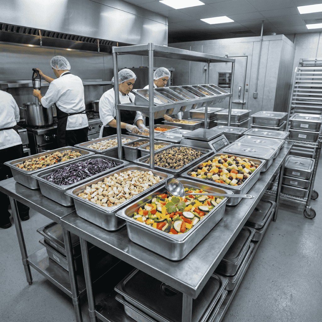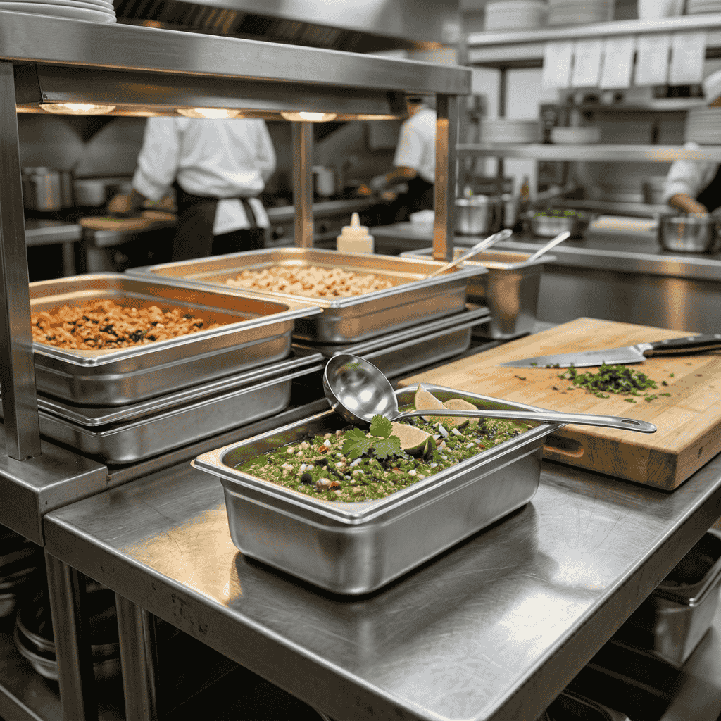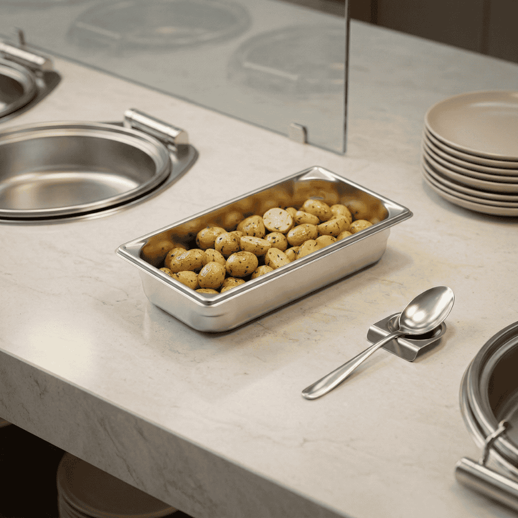 Su tamaño permite organizar guarniciones, proteínas o preparaciones listas para despacho sin saturar el espacio de trabajo. Fabricada en acero inoxidable de grado profesional, ofrece resistencia estructural, estabilidad térmica y limpieza sencilla, manteniendo un desempeño confiable incluso en jornadas de alta rotación.